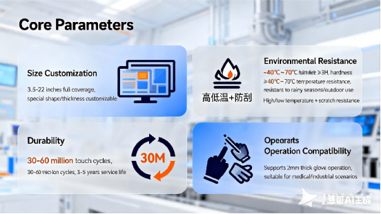 Core Conclusion: The core of industrial resistive touch screen parameters is “adaptability” – size, temperature resistance, and durability are all designed around scenarios, rather than simply stacking data. These parameters are not for “showing off”. For example, the -20℃ low-temperature resistance design can help you save on equipment modification costs for cold chain scenarios; the 60 million-time durability ensures you won’t need to replace the screen for 3-5 years, reducing operation and maintenance costs.