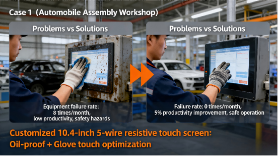 Core Case Value: For oil-contaminated and glove-operated scenarios, resistive touch screens can reduce the equipment failure rate from 8 times/month to 0, increase production capacity by 5%, and avoid operational safety hazards.