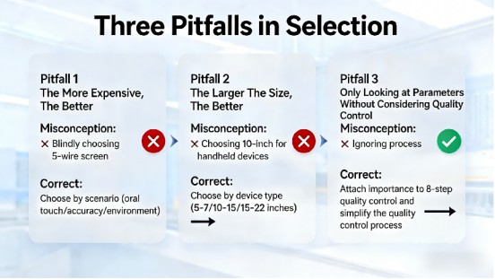 After reading these 3 cases, you probably have a clear understanding of the advantage scenarios of resistive touch screens. However, choosing the right resistive touch screen requires more than just knowing its advantages – many enterprises clearly choose the right type but end up with poor user experience because they fall into selection pitfalls. Based on years of customer service experience, we have summarized 3 high-frequency pitfalls to help you make the right choice without mistakes: