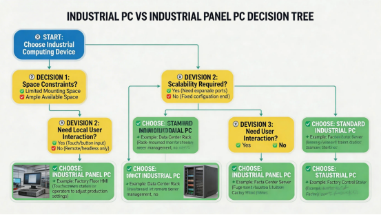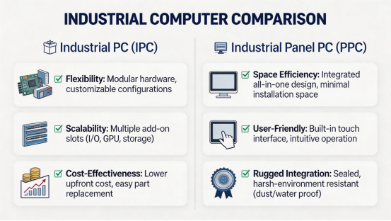 When choosing between an industrial PC and an industrial panel PC, consider your application’s space constraints, user interaction needs, and scalability requirements. For example, a factory floor with limited space may benefit from a panel PC, while a data center might prioritize the flexibility of a standalone industrial PC.