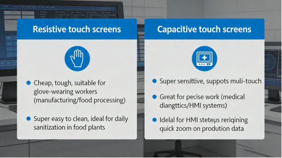 • Capacitive touch screens: Super sensitive, support multi-touch, and great for precise work (like medical diagnostics or HMI systems). They’re ideal for HMI setups where you need to zoom in on production data quickly without fumbling with buttons.