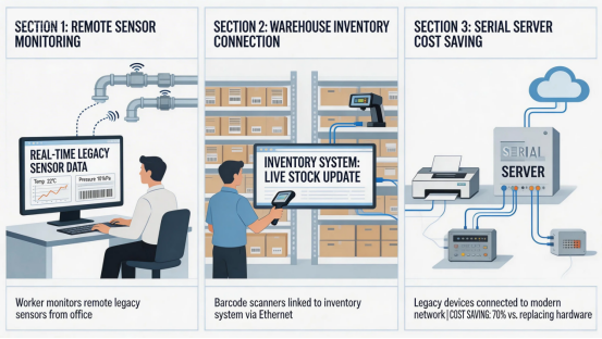A logistics team had legacy barcode scanners in different parts of their warehouse—they couldn’t hook them up to their inventory system because the serial cables were too short. Serial servers let them connect the scanners to their Ethernet network, so all inventory data syncs in real-time, no matter where the scanners are placed.