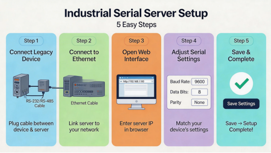 Setting up an industrial serial server isn’t complicated—I promise. Here’s a quick step-by-step, even if you’re not a tech whiz, to make your industrial serial server setup a breeze: