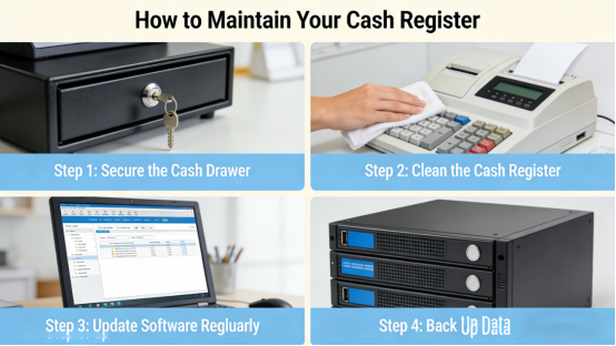 To keep your cash register (or cash till) running smoothly for years, follow these easy maintenance tips—most take 5 minutes or less per day: