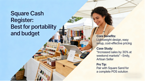– Square Cash Register: Best for portability and budget. This tablet-based system turns your device into a full POS, with free basic software (tracks sales, sends digital receipts) and low transaction fees (2.6% + 10¢ per in-person transaction). Ideal for pop-ups, farmers’ markets, food trucks, and new small businesses. Case study: Mia started a pop-up jewelry shop at local fairs and needed a portable, affordable way to process payments. She used her old iPad and a free Square card reader to ring up sales, and within a month, she was able to track which necklaces sold best (thanks to Square’s sales reports). This insight let her adjust her inventory to focus on her top-selling items—boosting her sales by 20% without extra marketing. Pro tip: Square offers a free card reader when you sign up, so you can start processing payments immediately.
