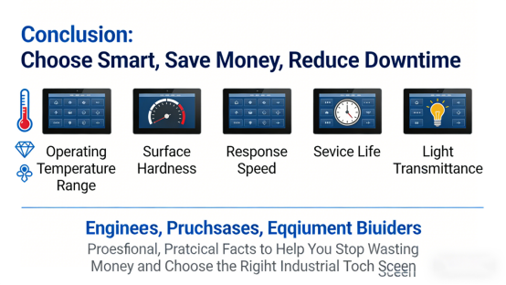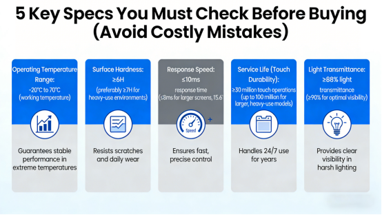 Choosing the right industrial touch screen doesn’t have to be complicated — focus on five key specs: operating temperature range, surface hardness, response speed, service life, and light transmittance.