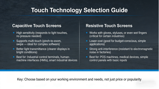 The key: Choose based on your working environment and needs, not just price or popularity. A capacitive screen is overkill for a simple POS terminal, while a resistive screen will frustrate users of complex industrial software.