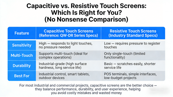| Feature | Capacitive Touch Screens (Reference: QW-DR Series Specs) | Resistive Touch Screens (Industry Standard Specs) |
