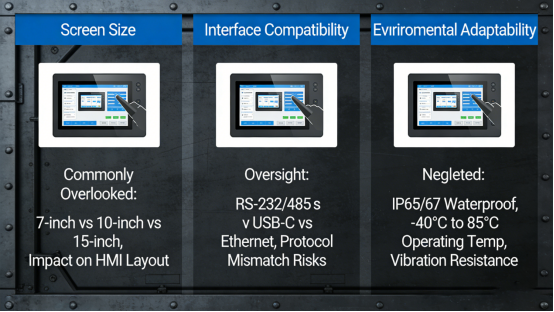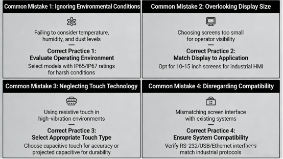 Using the wrong type of touch screen for your specific work scenario—such as selecting a capacitive screen for environments where operators must wear protective gloves, ignoring critical environmental factors like excessive dust or extreme temperatures that damage unprotected devices, or overlooking compatibility with your existing industrial equipment. All these issues can be easily fixed with targeted selection based on your actual needs.