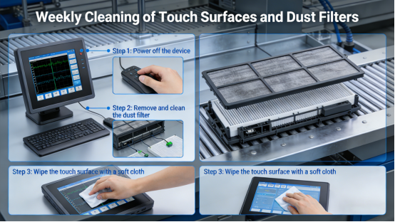 Step 1: Clean the touch surface and anti-dust filter. Use a soft, dry cloth to wipe the touch surface, removing dust and moisture buildup—this takes only 2-3 minutes and can be done during production breaks. Remove the anti-dust filter (per the product manual) and clean it with compressed air or a dry cloth—this fixes 50% of dust-related touch malfunctions and adds another 2 minutes at most. Reinstall the filter securely to maintain dust protection.Mistake to avoid: Using wet cloths to clean the touch surface or filter—this can cause moisture to seep into the display, leading to internal corrosion.