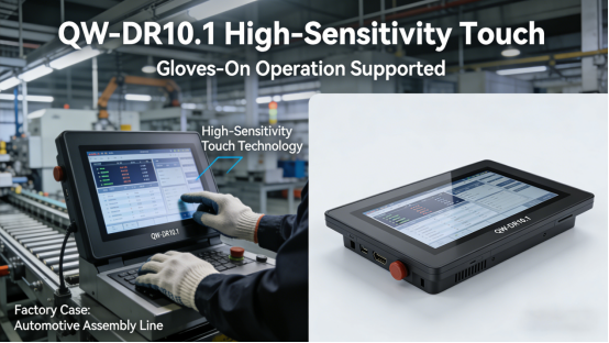 1. High-Sensitivity Capacitive Touch (Per Product Manual). The QW-DR10.1 adopts high-sensitivity capacitive touch technology (per the product manual), supporting 5-point touch and accurate response within 5ms. It can be operated smoothly with bare hands or industrial gloves (thickness ≤2mm), solving the problem of unresponsive touch in industrial scenarios. The touch accuracy is ±0.1mm, ensuring precise operation for equipment control and data input (refer to Chapter 3 of the QW-DR series product manual for detailed touch sensitivity specifications). Case: A Jiangsu auto parts factory uses the QW-DR10.1—workers can operate the screen smoothly with anti-cut gloves, reducing operation time by 20%.