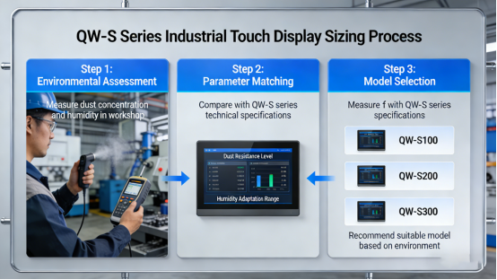 4. Enhanced Moisture-Proof Components. The QW-S Series’ internal components (e.g., circuit boards, connectors) are coated with a moisture-proof layer (per the product manual), which prevents corrosion and short circuits caused by moisture. The display also features a built-in dehumidification module (available in enhanced models, per the product manual) that automatically removes condensation, ensuring stable operation in high-humidity environments. This feature is critical for factories with frequent humidity fluctuations. Case: A Guangdong cement factory uses the QW-S Series with built-in dehumidification module— the display operates stably even during rainy seasons with high humidity, with no screen fogging or short circuits. With a clear understanding of the QW-S Series’ dustproof and moisture-proof features, the next step is to select the right model for your factory’s specific environment—follow these 3 simple steps to avoid mismatches.